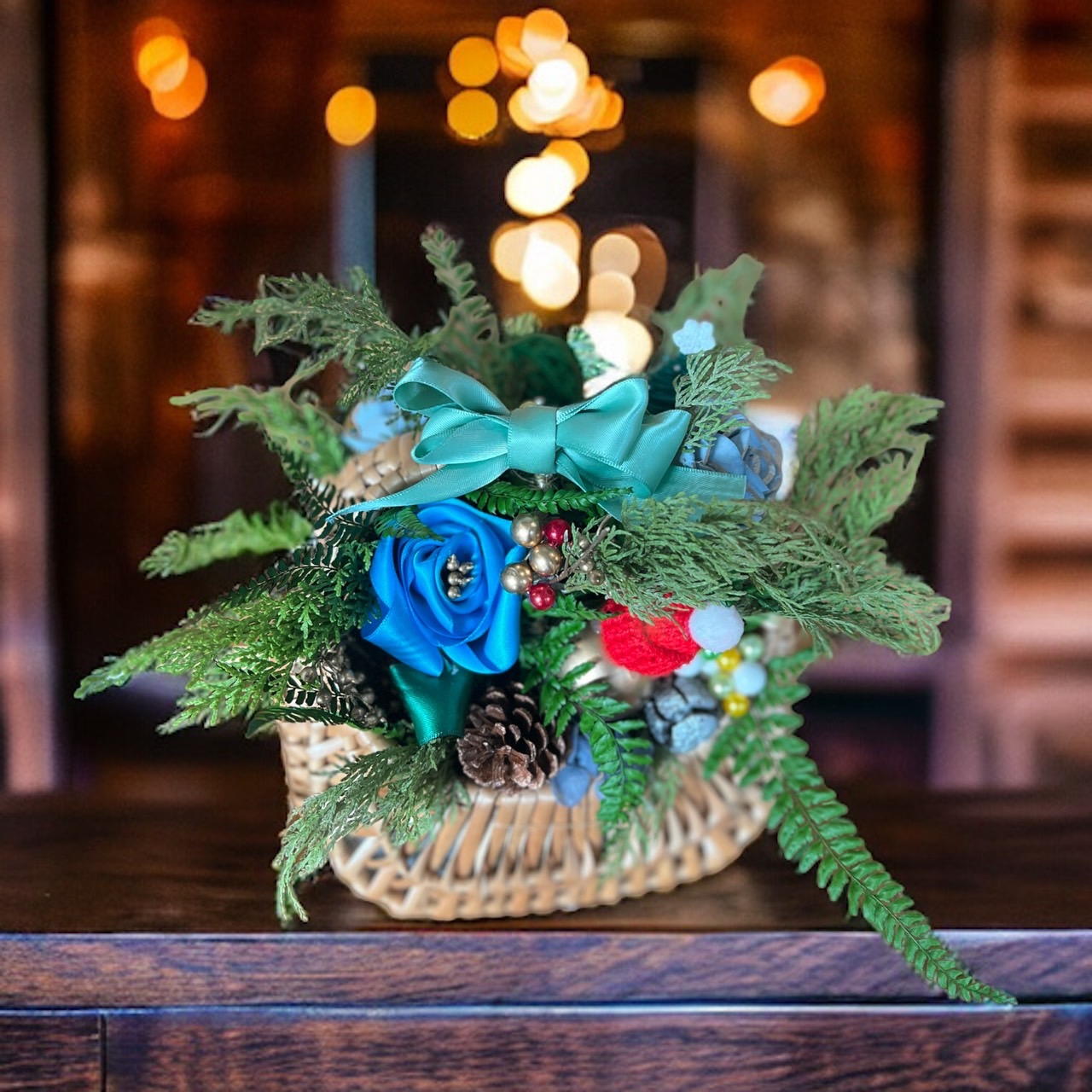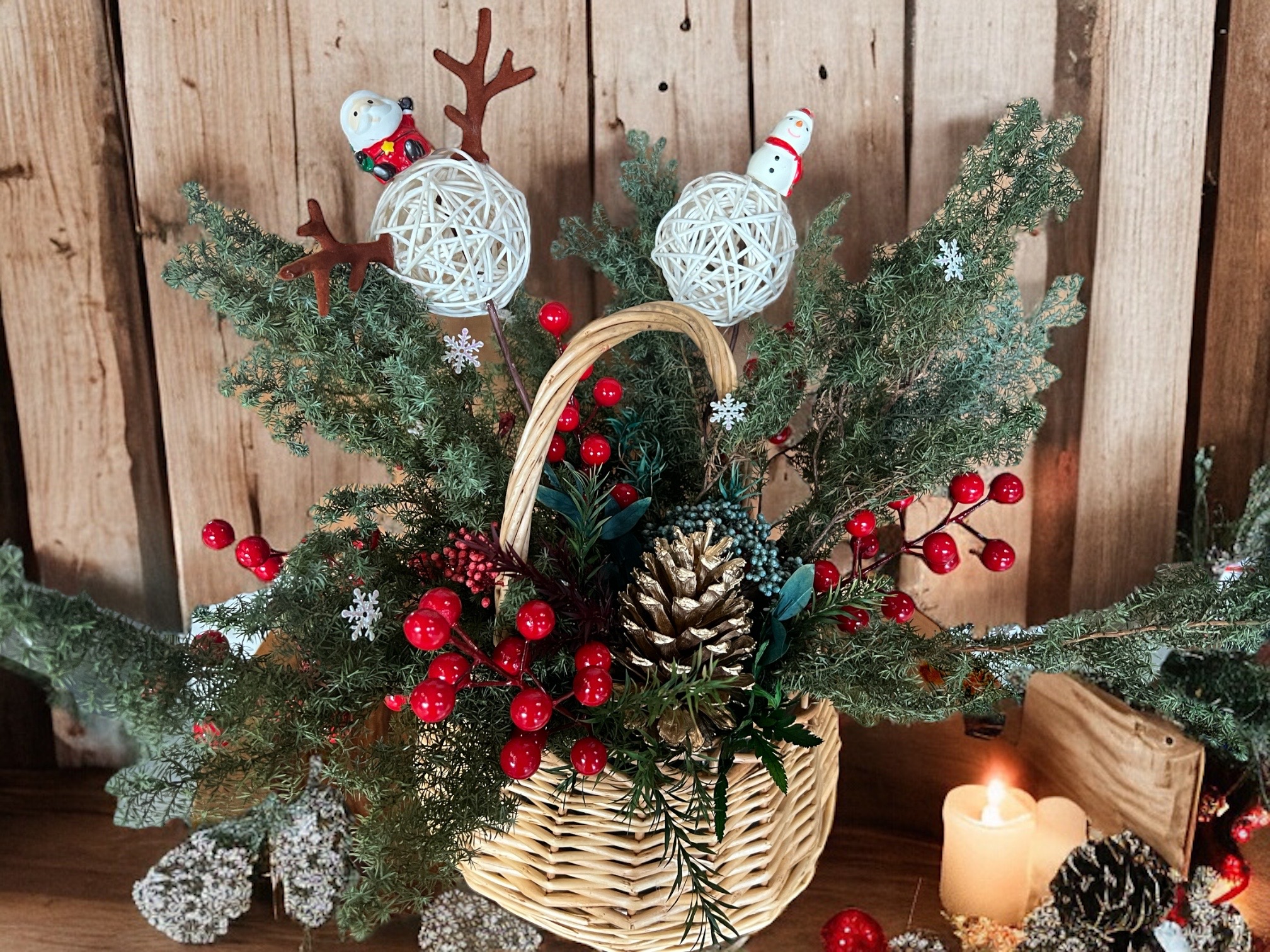 整體使用藍綠金色系,聖誕帽和聖誕老人街躲藏在樹枝裡,適合有大有小的裝飾品,像大金球和小金球,鐵絲皆使用綠色麻繩纏繞,更能隱藏,現成的工具像是花籃也可再加工,更獨一無二
