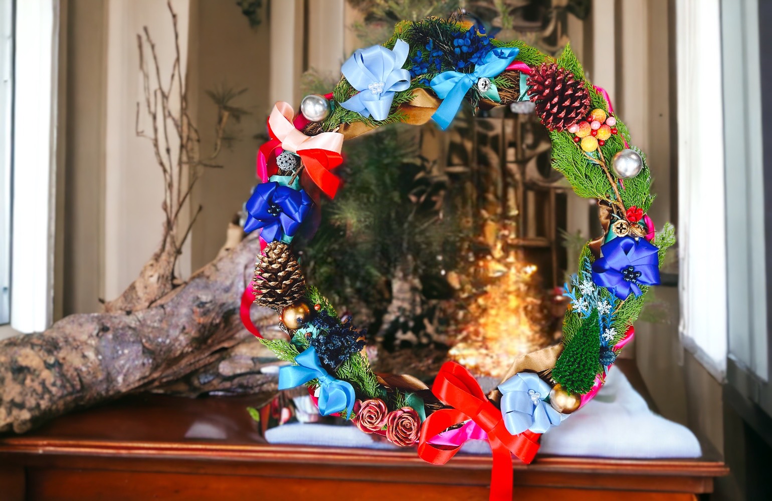 裝飾用紅藍色,也用粉和咖啡色緞帶纏繞整個花圈為基底,較少樹葉,聖誕樹也可當裝飾品,緞帶可製作不同造型的花,乾燥花用蝴蝶結固定變成迷你花束