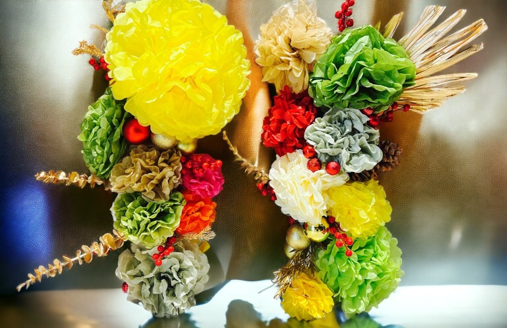 - 聖誕裝飾,不只在造型上做變化,不一樣的材質也會呈現不同的效果。 Ex: 像是緞帶可以做成不同造型的花,不同材質的緞帶可以帶來不同效果,甚至有花色的緞帶更富含意義