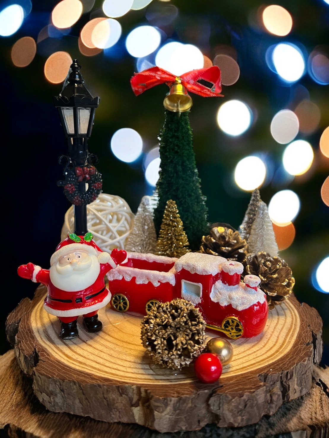 因為聖誕老人造型符合,有躲藏在樹後的感覺,雪橇剛好可搭配麋鹿,拐杖可黏在任何地方,都很符合聖誕主題,用絨繩綁在樹下當小亮點