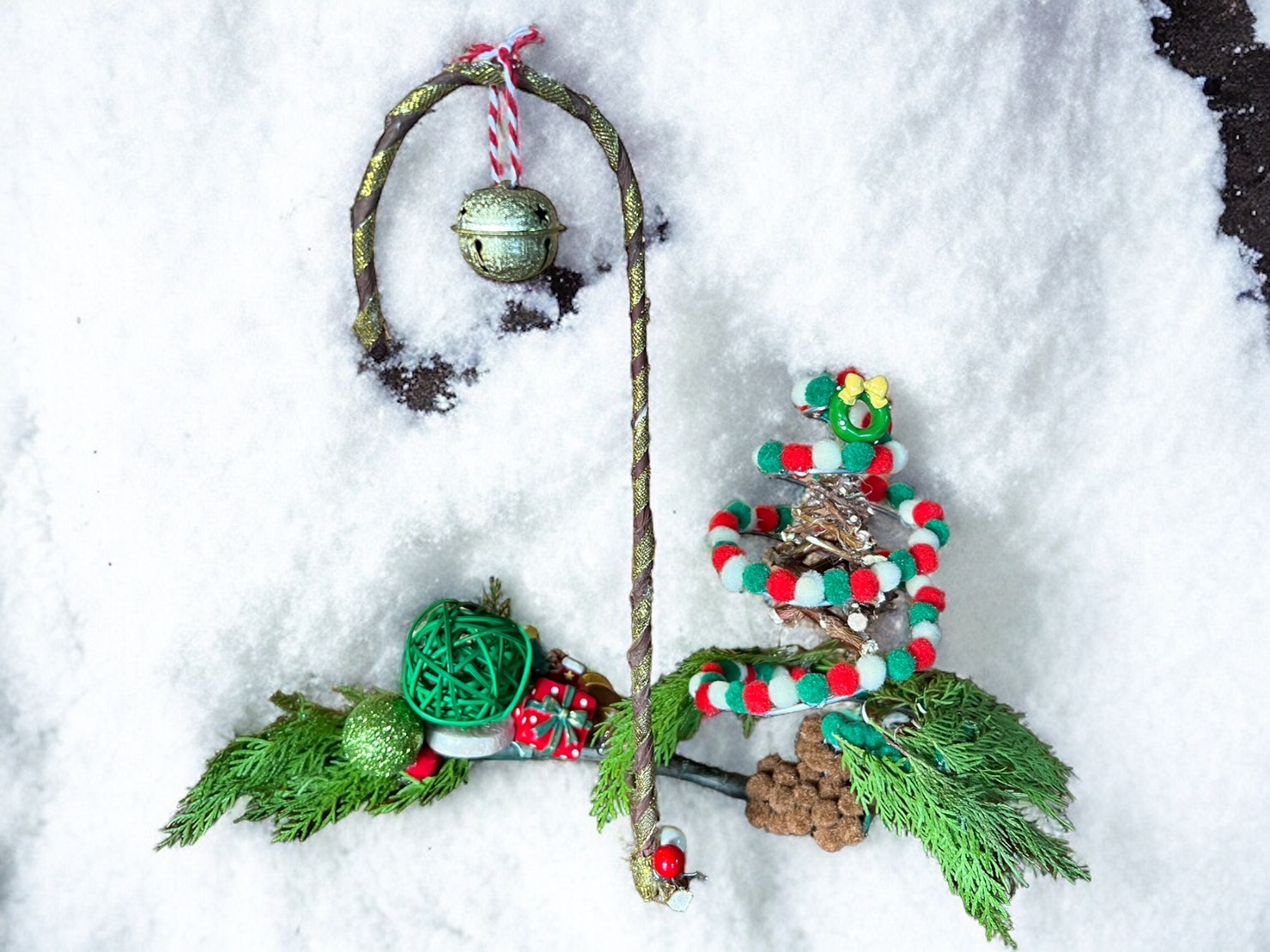以三根樹枝製作基底,鐵絲來來製作懸浮聖誕樹,裡面逛上樹枝做的聖誕樹造型裝飾,柺杖造型的鈴鐺柱也很符合聖誕節