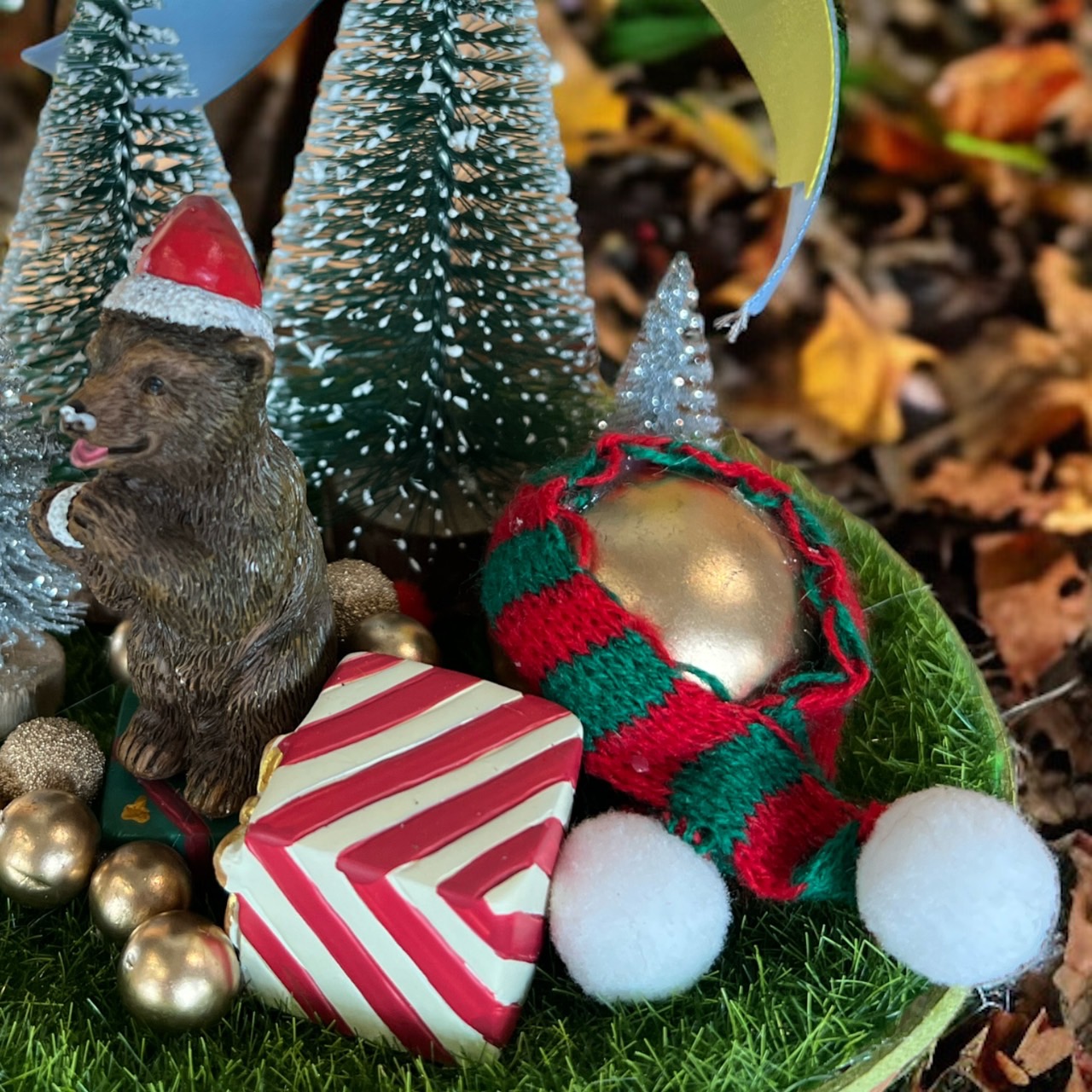 更長的草坪更有森林感,圍巾繞在金球上有很可愛,將雄年在禮物盒上也很俏皮,金色果實散落在周圍,用大大小小的聖誕樹圍繞