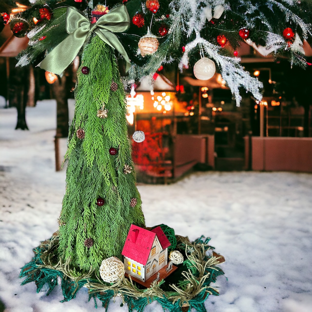 整體用一根一根扁柏年在錐形海綿上,木屋上客製化上色,一可以開關燈,所以沒有固定,用麻繩為讓托盤邊緣,不一樣的聖誕樹